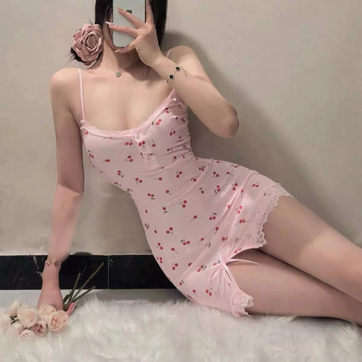 Trendy Pink Cherry Print Dress Women's Cute Fitted Mini Nightgown Lace Trim Detail Spaghetti Strap Summer Style New Fashion Hot